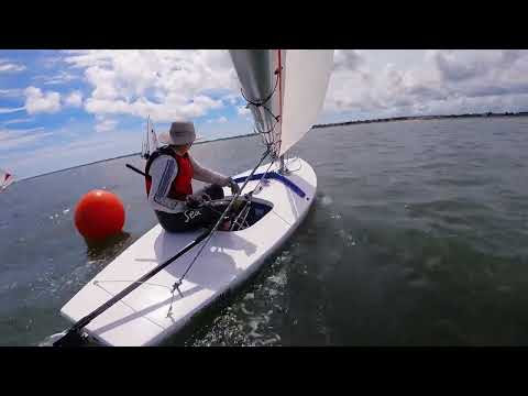 After the General Recall, the Race Committee declared anyone over the line within 1 minute before the start will be disqualified. The line was skewed to favor the pin, and it was crowded. I didn’t get clear air for the start, and almost got into to pin. To get clear air, I sailed far left of the fleet, gambling that the inbound tide had not yet created significant current off shore. That paid off, putting me in 5th rounding the windward mark. The downwind leg was remarkable only for the 4th place boat being notified by the RC that he was way over the line for the start, and therefore disqualified. He peeled-off to the right at the bottom of the course. I maintained my new 4th place on the final upwind, for my best finish of the regatta.
